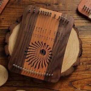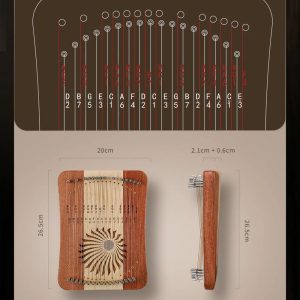 This is an innovative stringed instrument that follows the key arrangement of the kalimba and is played with the thumbs in the same way as kalimba, using both hands to hold the body and the thumbs to play. Different from the kalimba, it can be played both whole and chromatic, and the upper and lower strings can be played without interfering with each other, giving it a character and tone more in line with a lyre harp.