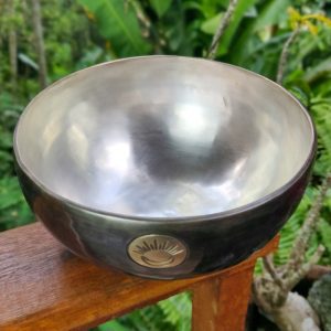 This chakra Newmoon bowl is 3 times hand hammered, made from 7 metals with 7% silver.