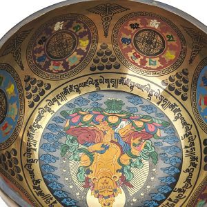 Special singing bowls with hand-painted thangkas by highly skilled artisans with many years of experience. The detail and execution are at the highest level in the Tibetan painting tradition. Traditionally, the thangka can depict Buddha, Tibetan deities, saints, or mandalas.
