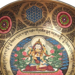 Special singing bowls with hand-painted thangkas by highly skilled artisans with many years of experience. The detail and execution are at the highest level in the Tibetan painting tradition. Traditionally, the thangka can depict Buddha, Tibetan deities, saints, or mandalas.